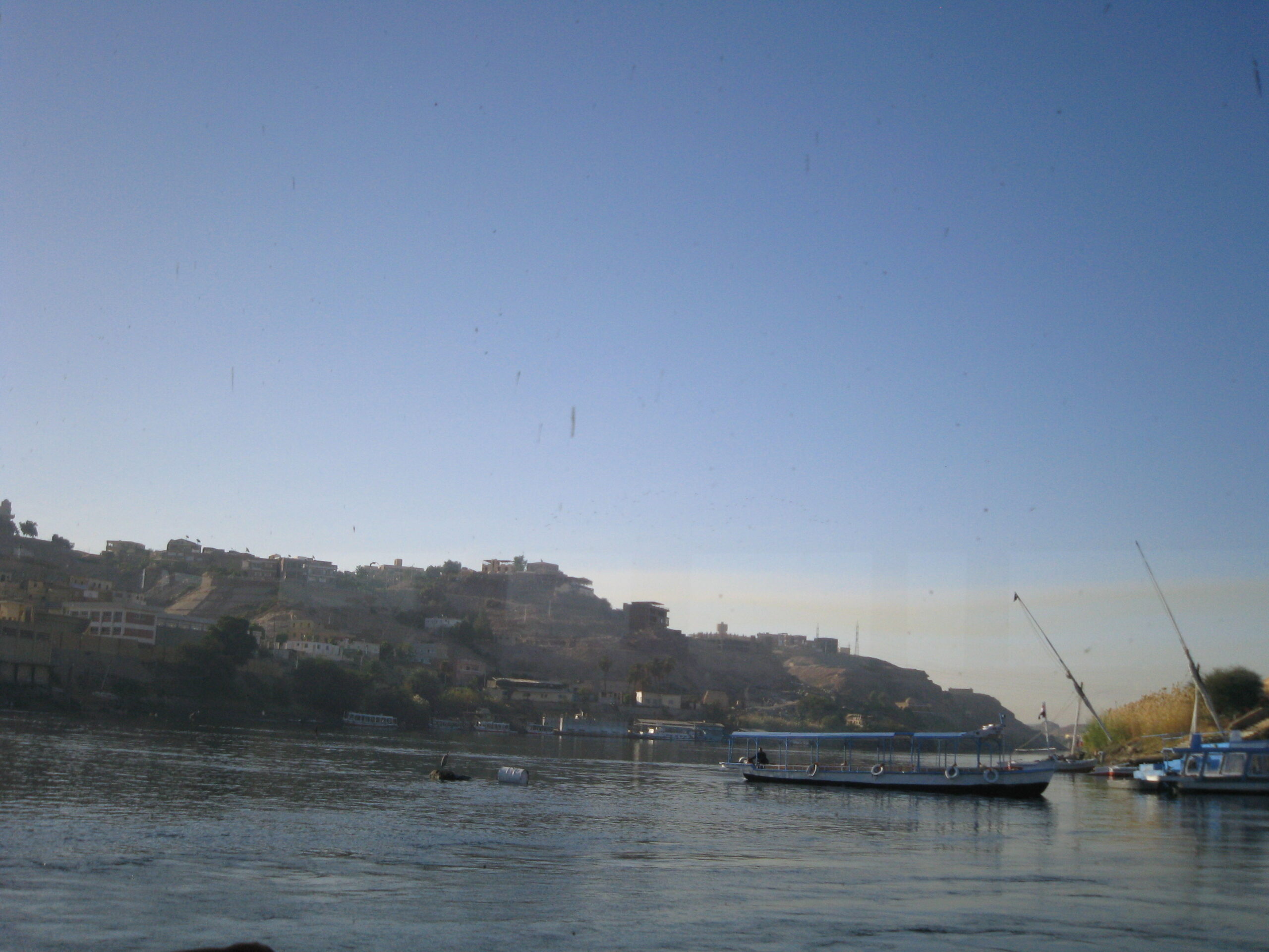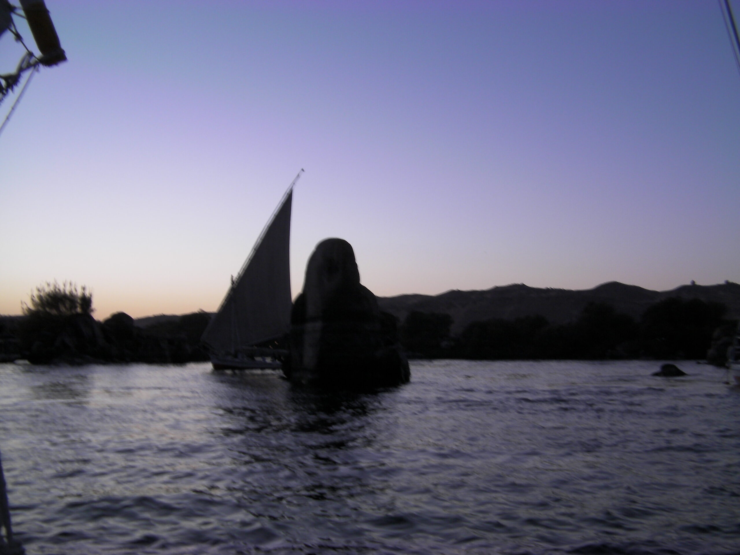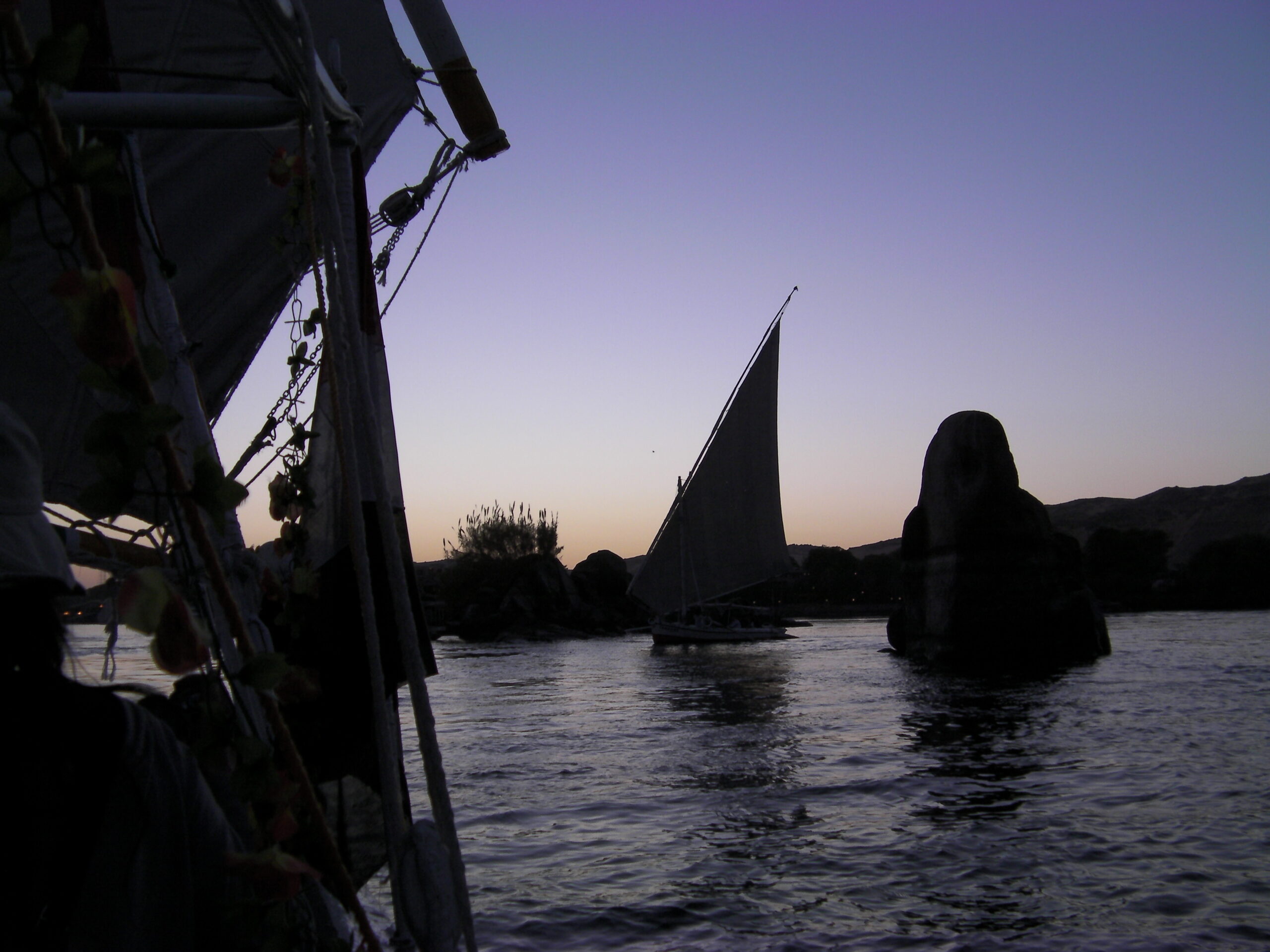 ナイル川のファルーカは風が吹かないと止まります。わたしたちのときも無風でファルーカが動かなくなってしまいました。船上の全員が大声で近くを通った観光遊覧船(エンジン船)を呼んで、ロープでつないでホテルまで曳航してもらいました。