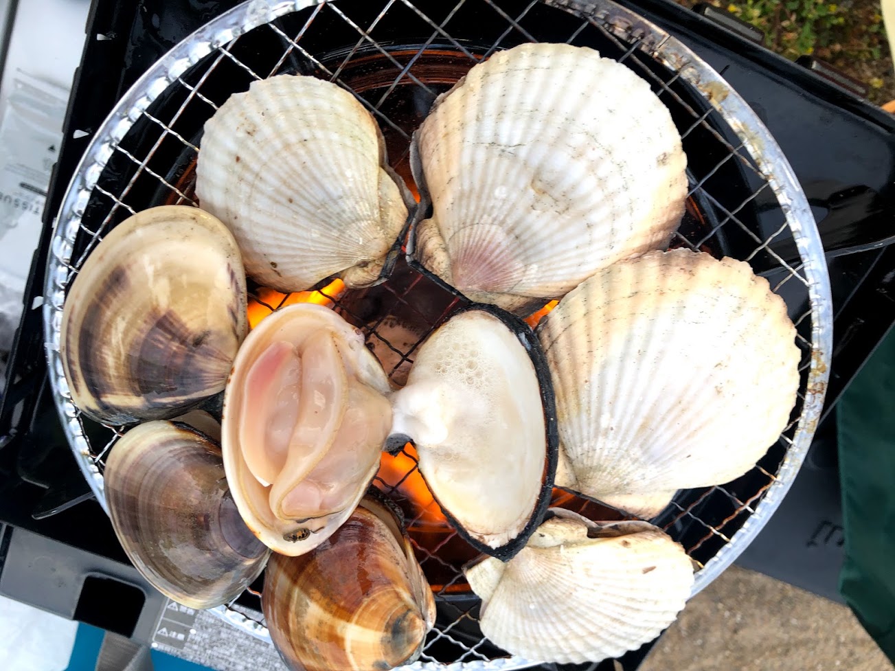 宿泊地は漁港が近く、ホタテとはまぐりが安く買えたので、イワタニのカセットコンロ「タブまる」で、焼いて食べることにしました。